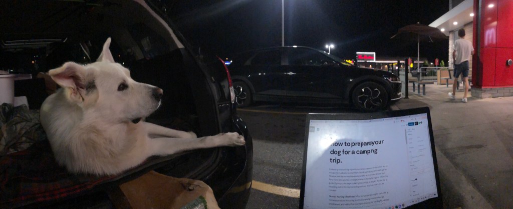 4. Introduce Camping Gear: Familiarize your dog with camping equipment gradually. Let them explore the tent, sleeping bags, and other gear in a relaxed setting. This will help reduce any anxiety your dog might feel when encountering new objects at the campsite. As i will be overlanding (sleeping in a rooftop tent) i’m teaching Eeki to sleep in the car before even leaving! As i type this 2023-08-28 11:17pm in a McDonalds parking lot, Eeki is relaxing in the car watching cars pass on the highway and people grab coffees in the drive through.
